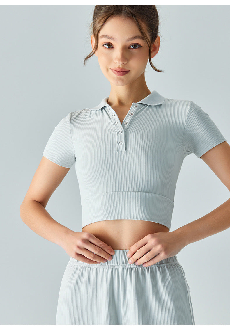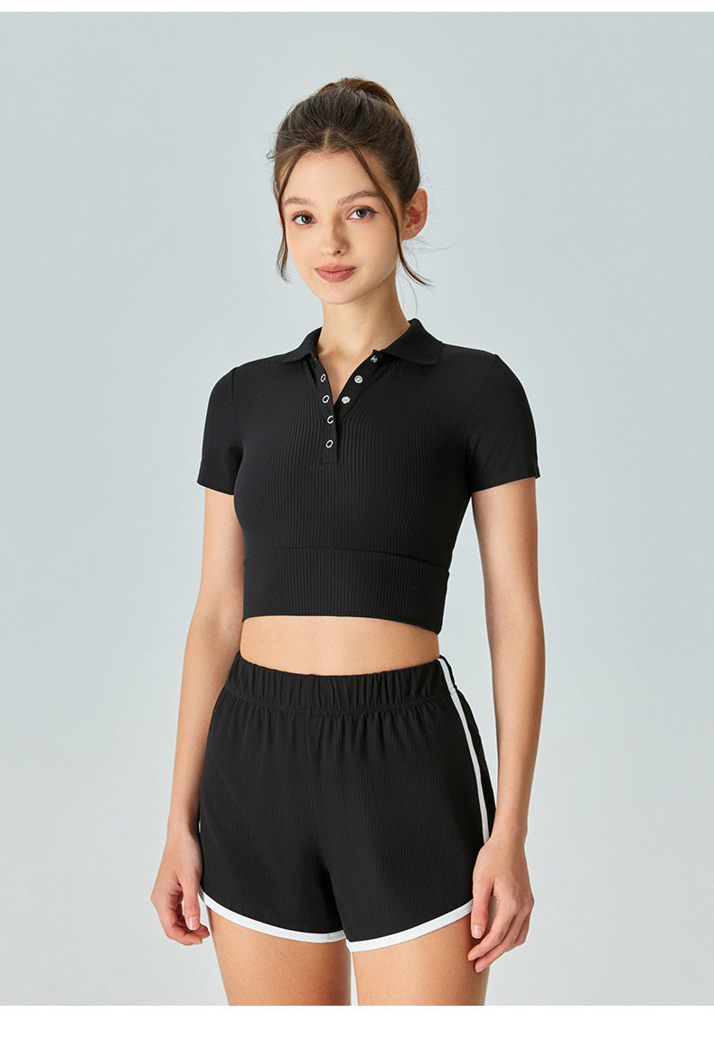 Elevate your yoga practice with our Kimn Shoulder Polo Collar Yoga T-shirt. Designed with a stylish polo collar and shoulder cutouts for increased flexibility, this t-shirt will keep you cool and comfortable during your workout. Take your yoga routine to the next level with Kimn!